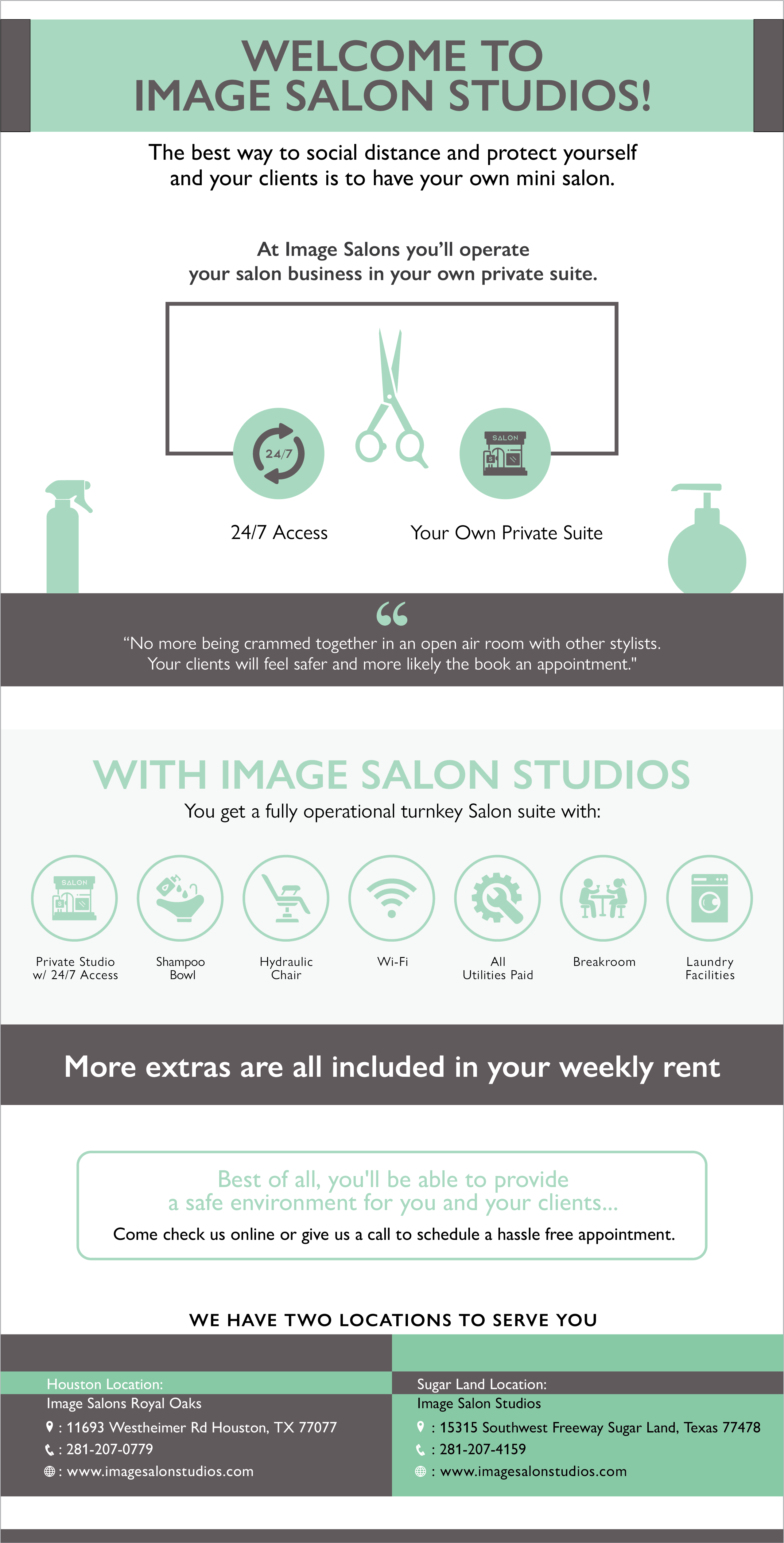 At Image Salons Studios we believe our concept offers you the best and safest option to receive your beauty services. Our business model was designed for distancing even before the pandemic, and its advantages are even more apparent at this time. We make every effort to provide you with a wonderful salon experience coupled with a high level of personal safety.